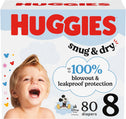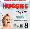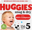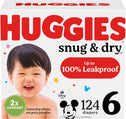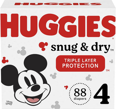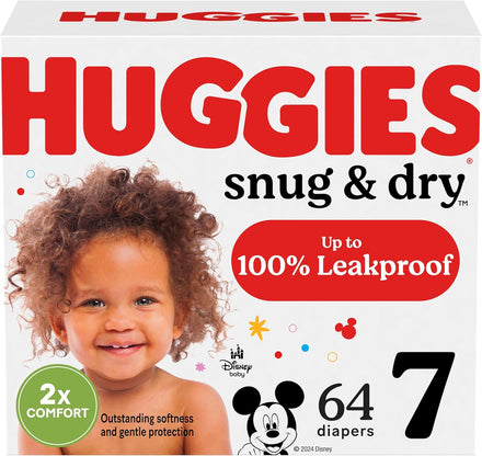 Our NEW Snug & Dry diapers are designed with 2x softness: CloudSoft absorbent layers and waistband and a curved and stretchy fit. Softer than the leading premium diaper, more parents choose Huggies Snug & Dry infant diapers as softer.* With Snug & Dry baby diapers, you can bring up to 100% leak and blowout protection to your diapering routine. Made with the original Leak Lock blowout blocker, Snug & Dry baby diapers help provide up to 100% leak proof and blowout protection. Additionally, these diapers are designed with a curved and stretchy fit and outstanding leakage protection. As the only leading brand that is entirely fragrance free,* Snug & Dry newborn diapers are free of fragrances and elemental chlorine. They are also made without lotions and natural rubber latex. To better alert you when a diaper change is needed, the wetness indicator on Snug & Dry infant diapers changes color when wet. Available in exclusive Disney designs, Huggies Snug & Dry Diapers are available in size Newborn (6-9 lb.), size 1 (8-14 lb.), size 2 (12-18 lb.), size 3 (16-28 lb.), size 4 (22-37 lb.), size 5 (27+ lb.), size 6 (35+ lb.), size 7 (41+ lb.) and size 8 (46+ lb.). (*vs leading premium diaper) (**among leading national diaper brands, across all offered variants) (***among branded open diapers. Excludes preemie size.)