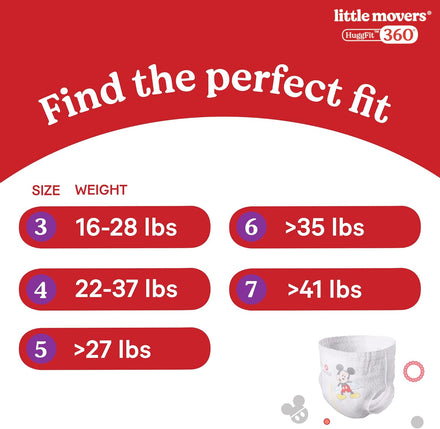 Huggies Little Movers HuggFit 360° Baby Diapers have 360° protection to help prevent leaks from any angle and an extra secure waistband designed to move with baby during play. HuggFit 360° slip-on diapers also provide an extra secure fit for up to 100% blowout and leakproof protection. Our diaper pants have 4X Advanced Leak Blockers that are thicker, curvier, more elastic, and have softer leg guards* (*vs. Pampers Cruisers 360°). HuggFit 360° diapers are also made without parabens, phthalates, lotions, elemental chlorine and natural rubber latex. They also provide more butt coverage* (*vs Pampers Cruisers 360°). A wetness indicator built into the pull-on diaper baby diaper can let you know in a timely fashion when it is time for a change. Little Movers HuggFit 360° Baby Diapers are available in size 3 (16-28 lbs), size 4 (22-37 lbs), size 5 (27+ lbs), size 6 (35+ lbs) and size 7 (41+ lbs). (*vs Pampers Cruisers 360°)