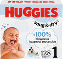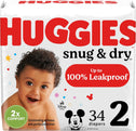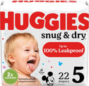 Our NEW Snug & Dry diapers are designed with 2x softness: CloudSoft absorbent layers and waistband and a curved and stretchy fit. With Snug & Dry baby diapers, you can bring up to 100% leak and blowout protection to your diapering routine. Made with the original Leak Lock blowout blocker, Snug & Dry baby diapers help provide up to 100% leak proof and blowout protection. Additionally, these diapers are designed with a curved and stretchy fit and outstanding leakage protection. As the only leading brand that is entirely fragrance free,* Snug & Dry disposable diapers are free of fragrances and elemental chlorine. They are also made without lotions and natural rubber latex. To better alert you when a diaper change is needed, the wetness indicator on Snug & Dry baby diapers changes color when wet. Available in exclusive Disney designs, Huggies Snug & Dry Diapers are available in size Newborn (6-9 lb.), size 1 (8-14 lb.), size 2 (12-18 lb.), size 3 (16-28 lb.), size 4 (22-37 lb.), size 5 (27+ lb.), size 6 (35+ lb.), size 7 (41+ lb.) and size 8 (46+ lb.).(*among leading national diaper brands, across all offered variants) (**among branded open diapers. Excludes preemie size.)