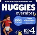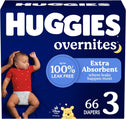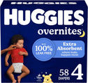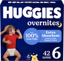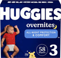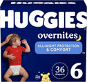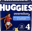 The #1 best-selling overnight diaper,* Huggies Overnites nighttime diapers feature extra absorbency and softness to help provide all-night protection and comfort. Up to 100% leak free, Overnites baby diapers provide up to 12 hours of nighttime leak protection. Overnites feature 4X sleep protection: curved fit, DryTouch Liner, double-grip strips and extra absorbency. Designed specifically for nighttime protection, each overnight baby diaper is made with extra absorbency to help provide all night protection. For your baby’s comfort, our baby diapers have pillowy soft leg cuffs and a curved and stretchy fit. Our disposable diapers are hypoallergenic, and made without fragrance, lotions, parabens, phthalates, elemental chlorine and natural rubber latex. Huggies’ added wetness indicator lets you know if your little one is in need of a diaper change. Huggies Overnites night time diapers feature cute Disney designs for the sweetest dreams and are available in size 3 (16-28 lbs), size 4 (22-37 lbs), size 5 (27+ lbs), size 6 (35+ lbs) and size 7 (41+ lbs). For daytime protection, try Huggies Little Movers! (*52 weeks ending 8/3/2024)