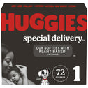 Special Delivery Diapers are made with responsibly sourced plant-based* materials and do not contain harsh ingredients. Clinically proven hypoallergenic for sensitive skin & dermatologically tested; Special Delivery baby diapers are paraben free; fragrance free; and free of elemental chlorine bleach. Special Delivery are Huggies' softest diaper ever; with a super soft absorbent core to help maintain dry; healthy skin and up to 12 hours of trusted leak protection. Flexible leg cuffs help keep the mess in; while the Pocketed Waistband and improved leakage protection help prevent leaks & diaper blowouts (size NB-2). Special Delivery disposable diapers are designed with a 100% breathable outer cover to help keep baby dry & comfortable; plus wetness indicator to let you know when it's time for a diaper change. Huggies Special Delivery Diapers feature adorable; nature inspired designs and are available in size Newborn (up to 10 lb.); size 1 (up to 14 lb.); size 2 (12-18 lb.); size 3 (16-28 lb.); size 4 (22-37 lb.); size 5 (27+ lb.); and size 6 (35+ lb.).