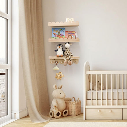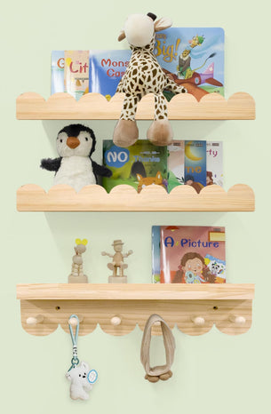• 🥰The 2024 scalloped nursery shelves features a versatile design that incorporates valuable customer suggestion, resulting in enhanced functionality. We have incorporated hooks to accommodate books, photo frames, toys, and other decorative items based on customer input. Additionally, the hooks on the nursery bookshelf provide convenient storage options for kids clothing or towels, bags, and more. This innovative solution offers flexibility in organizing your kids room.