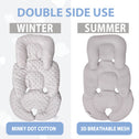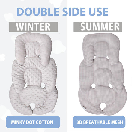 • ☁️VERSATILE FOR ANY SEASON: The reversible infant car seat insert cushion offers ultra-soft mink polka dot fabric on one side to keep your baby warm in winter, breathable wicking mesh on the other side to keep them cool in summer. The soft, breathable fabric contributes to a cozy environment for the baby.