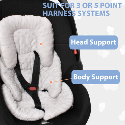 • ☁️2-IN-1 TWO-SIDED USE: Our two sides of this Infant car seat head & body support is made of different materials, 3D Minnky Dot on the front is soft and comfortable, 3D air mesh on the back is breathable and absorbs sweat. Cozy and Versatile Support. It can also be used with our car seat cover, strap covers to decor your baby carseat or stroller.