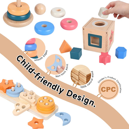 • Ideal Gift for Toddlers: The versatile play styles of our 4-in-1 set capture your child's attention in seconds. Babies can easily learn valuable skills while playing, helping them explore the world around them. This makes it the perfect toy for early childhood education! The elegant wooden toy box also makes it an ideal birthday or Christmas gift for babies and toddlers