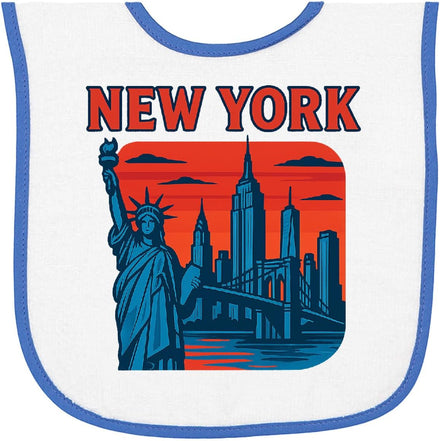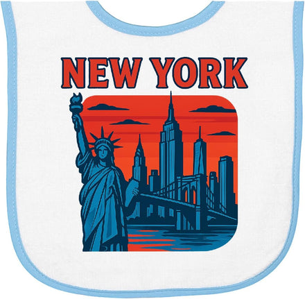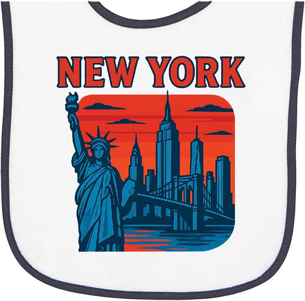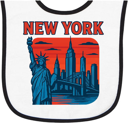 This stylish Baby Terry Cloth Bib features the iconic New York City skyline, including the Statue of Liberty and Brooklyn Bridge, set against a vibrant sunset.