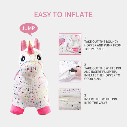 • 【UNICORN PALS】Inflatable hopper is covered with soft, removable, and easy-to-clean plush. As a member of the family, the bouncer unicorn is made of safe, odorless, thickened, and durable material. Protect your kids and brings infinite happiness. : Easy to grip and kids can stay stable on the hopping horse made of anti-slip material. Contains no US banned phthalates and heavy metal elements. BPA free-conforms to the safety requirements of EU EN71, US CPSIA & ASTM F963.