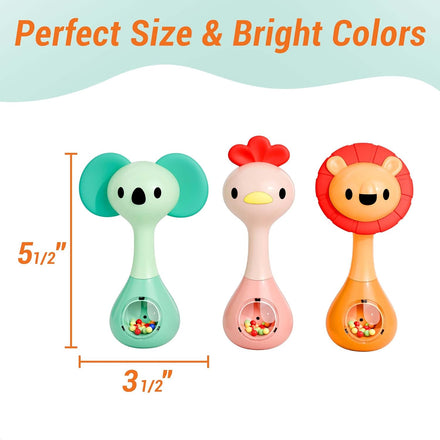 • 【3-IN-1 Baby Maracas Rattle Set】Designed to combine a teether, a rattle, and a musical instrument. Supports early development of hearing, grasping, and soothing. These colorful maracas contain beads; with every gentle shake, they create pleasant sounds that stimulate the auditory and visual senses.