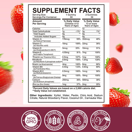 • ALL-IN-ONE NUTRITIONAL BOOST: Each gummy is loaded with 12 essential nutrients! With vitamin D3 and calcium for bone and immune health, B12 for energy, vitamin E and zinc for antioxidant support, and iron for healthy blood—our gummies support your child's growth and energy needs