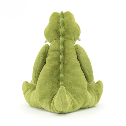 Details: Take a seat next to Bryno Dino and watch the world go by. This apple-green dino is bold and eccentric, with a bobbly brow, knobbled nostrils, suedette tusks and huge squashy feet, not to mention that wedge tail embroidered with spines.