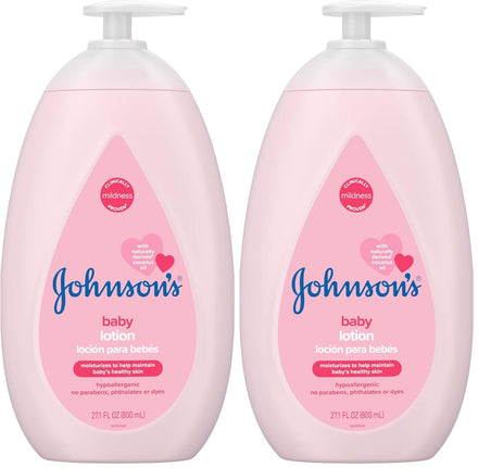 Moisturize your little one’s skin with Johnson’s Baby Lotion with coconut oil, aloe vera, and vita-min B5. Gentle enough for babies and the whole family, this newborn lotion is proven to hy-drate skin for 72 hours. Specially formulated for newborn and delicate skin, it moisturizes, pro-tects from dryness, and strengthens skin. Pediatrician & Dermatologist tested, this pH-balanced lotion has a unique gentle baby scent and is hypoallergenic with no added parabens or dyes. Our formula can help fight the 5 signs of itchy dry skin such as – itchiness, tightness, flaking, scaling, and redness. Johnson’s Baby cares for what is precious: your baby’s precious skin and hair, and precious moments of bonding. Packaged in a bottle made with 50% recycled plastic. Part of the perfect 3-step bath routine: 1. Shampoo with Johnson's Baby Shampoo 2. Wash with Johnson’s Head-To-Toe Wash & Shampoo 3. Moisturize with Johnson’s Baby Lotion Our Formula: Now with Aloe Vera & Vitamin B5: Our formula, with aloe vera, vitamin B5 and coconut oil, hydrates delicate skin, leaves skin feeling soft, and supports a healthy skin moisture barrier. Hypoallergenic, pH-balanced, and formulated with no added parabens or dyes. Tested by Pediatricians; made with unique gentle baby scents How to Use: After a warm bath with Johnson’s Baby Shampoo and Johnson’s Baby Head-to-Toe Wash, gently massage Johnson's Baby Lotion over baby’s entire body for 72-hour hydration. Can also be used anytime to moisturize skin. Brand Story: Johnson’s Baby cares for what is precious: your baby’s precious skin and hair, and precious mo-ments of bonding. For over 125 years, we’ve been committed to crafting gentle, science-backed baby care products that support happy, healthy bonding moments. World's #1 Baby & Child Care Brand* *Source Euromonitor International Limited; Beauty and Personal Care 2025 ed. As per Baby and Child-Specific Products Category; all retail channels; value sales at RSP; 2024 data.