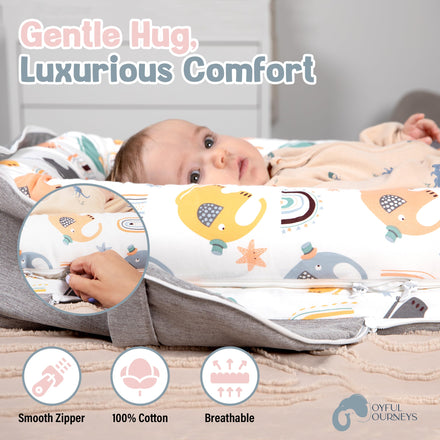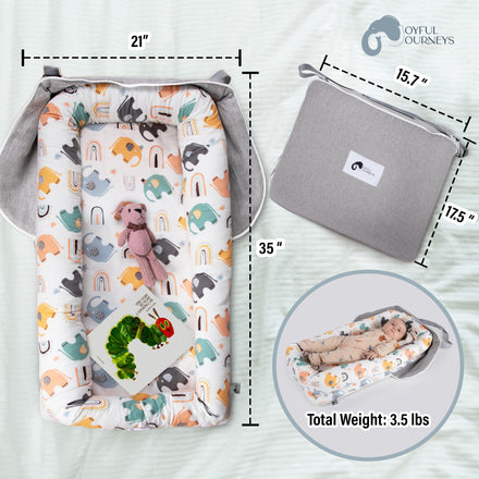 Joyful Journeys Baby Lounger - 2 in 1 Infant Lounger Baby Nest/Diaper Organizer - 100% Cotton Lounger Pillow - Portable Baby Lounger Travel Bed - Newborn Essential - 0-18 Months (Neutral Elephants)