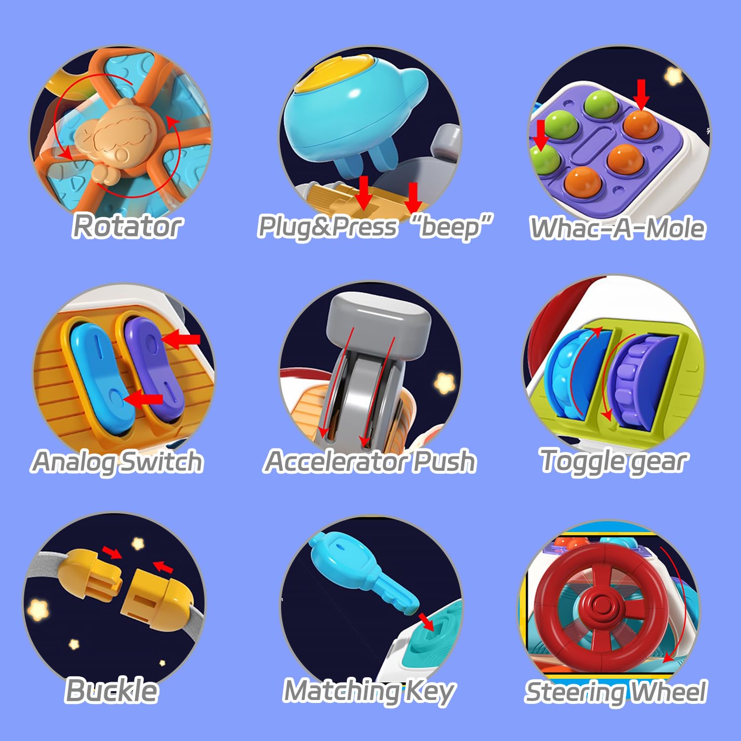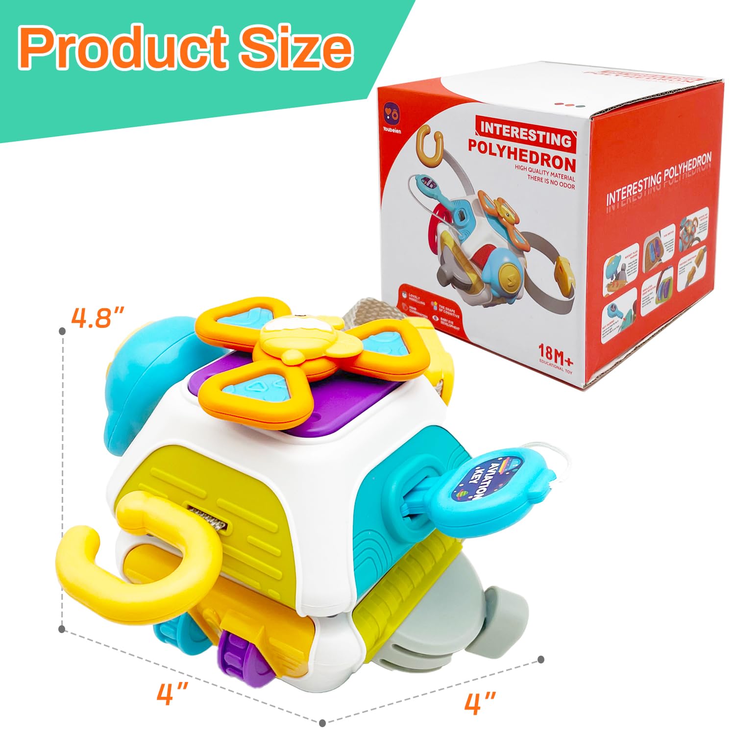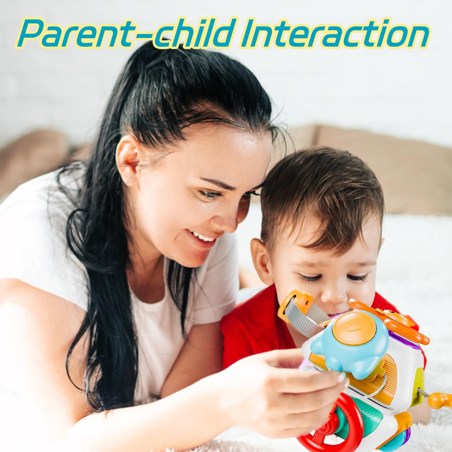 • 【Montessori Busy Cube Toys】This Montessori toys includes 10 funny activity panels includes rotating steering wheel, spinning spinner, analog plug, fun switches, flight simulation accelerator, simulated gear rotation, portable wristband clasp, key pairing and happy gopher. These are perfect Montessori toys for toddlers, keep children busy and entertained for hours fostering their creativity and imagination.