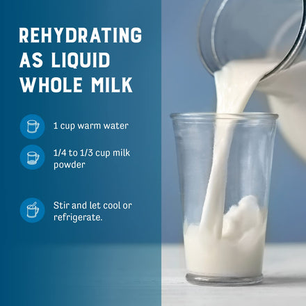 • For recipe substitutions, combine 1 cup warm water with 1/4 to 1/3 cup Milk Powder to make 1 cup of Whole Milk