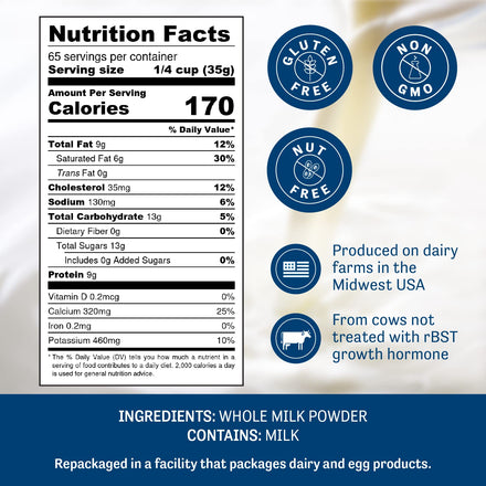 • 100 Percent Dehydrated Whole Milk that is great to use in confections, baked goods, as a nutrient supplement, as an ingredient in dry blends, or reconstituted for use as liquid milk