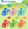 • Funny Animal Car Toys Set - You get a great value pack of 6 animal press and go cars. The bright colors, cute cars, and lovely animal drivers will make your 1-year-old baby curious. Press these car toys for ages 0-2 toddlers one by one and watch their speed across the floor at home, at family gatherings, in the park, or on trips. Let your toddlers have endless fun!