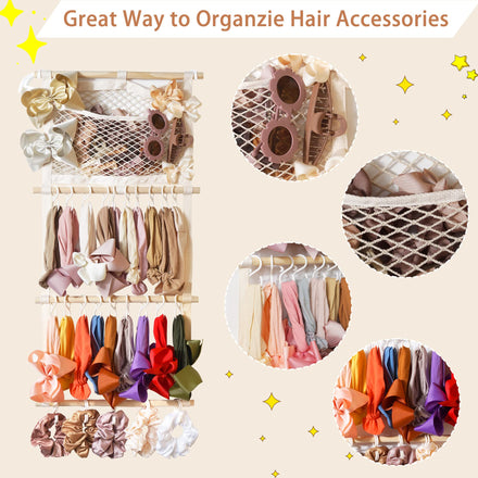 • 【LARGE STORAGE CAPACITY】- (BOWS AND HEADBANDS NOT INCLUDED) Size as shown in the picture:30inches. Each S-shaped hook can hold 2 baby headbands, and the headband holder can store up to 60 baby nylon headbands and the mesh bag design can store hair clips and small items for babies. The super strong storage ability neatly organizes all baby hair accessories in one place for easy retrieval.