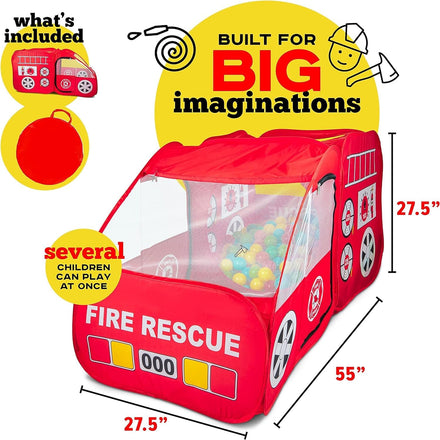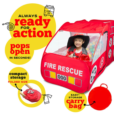 • SPACIOUS FUN & VERSATILITY: Kiddey pop up tents for kids accommodates your child and their friends for hours of imaginative play. And when the firefighter action subsides, transform the kids fire truck tent into a ball pit and wear the kids firefighter costume for even more playtime fun.