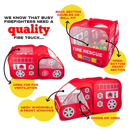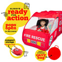 • FIRE TRUCK POP UP PLAY TENT ADVENTURE: Press the SIREN button and watch as your child's imagination comes to life with 6 lifelike fire truck siren sounds and real 911 dispatch calls. Every play moment turns into an exciting firefighting adventure, where heroes are born and daring rescues unfold.