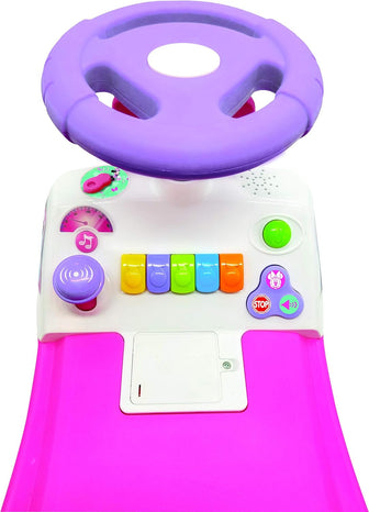 Hear Minnie play her favorite music as she turns her head and dances to the beat! interactive electronic activities to play rewarding lights and fun sounds. Steer wheel and honk horn for a great driving fun. Sturdy and durable construction for hours of safe play!
