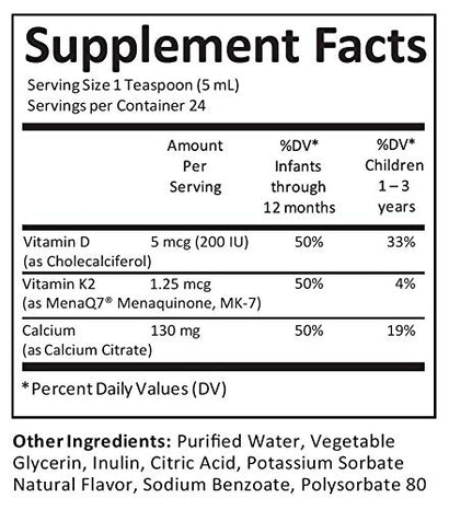 • Just One Teaspoon Per Day – Each teaspoon (5 mL) contains 130 mg of Calcium (as Calcium Citrate), 1.25 mcg of Vitamin K2 (as MenaQ7 Menaquinone, MK-7), and 200 IU of Vitamin D3.