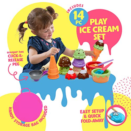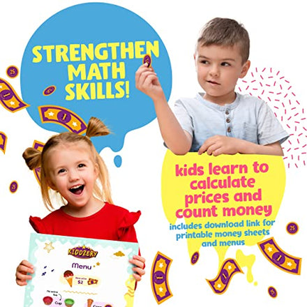 • BONUS ACCESSORIES INCLUDED: With your purchase, you'll get a complete set of ice cream toys for kids (14 pieces) that'll encourage hours of imaginative play. Let the little customers choose what they'd like to eat, and pay with their own money using the ORDER SHEET and PLAY MONEY, scan QR code on the package to download.