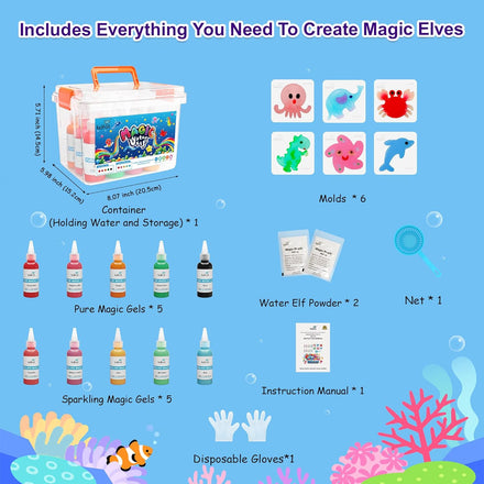 • The 10 Sea Creature Colors Magic Water Elf Toy Kit includes 5 color pure magic gels, 5 color sparkling magic gels, 6 sea creature molds, 2 packs magic powder, and 1 piece net.