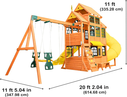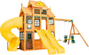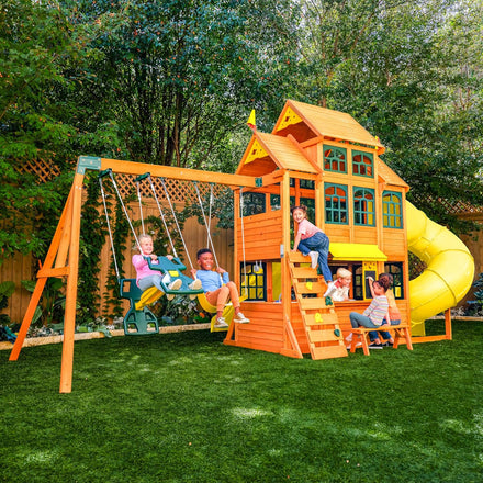 Kids’ playset or Eighth Wonder of the World? The Atlas Point Swing Set by KidKraft is just that awesome. So awesome, in fact, it’s capable of keeping up to 13 energetic kids busy and happy. For starters, this wooden outdoor playset features three amazing slides—two high-rail wave slides for racing side by side and one thrilling 12-foot Twist-n-Ride tube slide. The excitement continues with a multi-colored rock wall that leads to the spacious upper clubhouse (perfect for secret meetings). Downstairs, a deluxe play kitchen with stovetop, sink and accessories delights future chefs. Plus, there's a double-sided chalkboard for writing out daily menus. A large café window and moveable bench are just right for serving snacks to your friends and family. And when the clock with moveable hands says it’s time to go, a quick dash to the belt swings or two-person glider starts a brand new adventure. The full two-level structure is like having a playhouse and swing set in one, right in the comfort of your own yard. Crafted of premium wood with a child-friendly stain, Atlas Point delights all with its shiplap roof, decorative gables and rounded arch windows. A true wonderland of fun without ever leaving home.