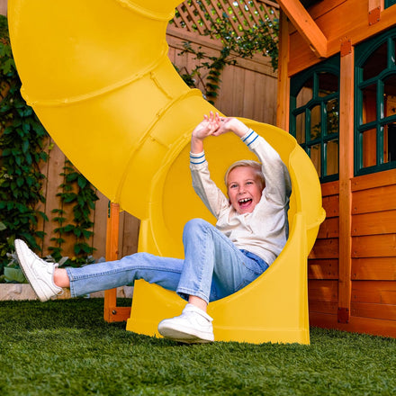 • Twist N’ Ride tube slide and two high-rail wave slides, play clock and double-sided chalkboard
