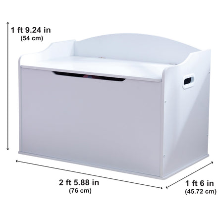 Keep toys and treasures safe in the KidKraft Austin Toy Box. With its classic, handsome design, this toy box can double as a bench and provides a useful addition to any playroom. Designed with children in mind, the lid's unique safety hinge prevents accidental dropping to help protect little fingers. Sturdy wood construction makes this this a lasting addition to any kid's room.
