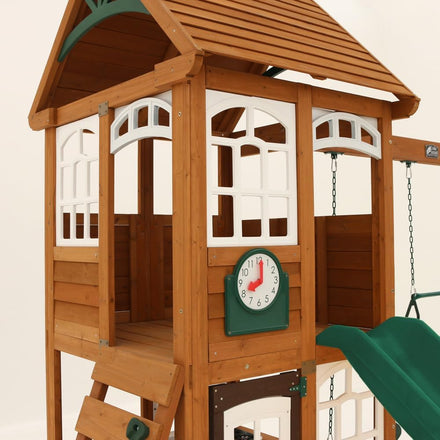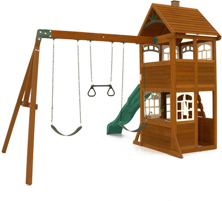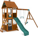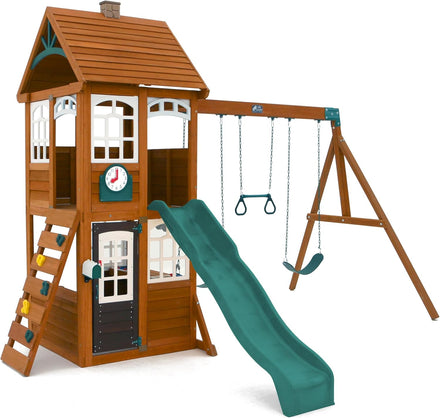 Even a smaller backyard can be big fun with the Kennedy Springs Swing Set by KidKraft. Accommodating up to nine energetic kids, this wooden playset packs maximum wow-power into minimum space. The deep high-rail wave slide proves bumpy rides are the best. And the innovative rock wall ladder goads young mountaineers to new heights (aka the upper clubhouse), while two sturdy belt swings and a gymnastic acrobar prompt young high-fliers to reach for the sky. Meanwhile, the detail-rich two-story clubhouse provides nonstop entertainment with its own play kitchen, including stove, sink and utensil shelf with accessories. There’s also a play phone, clock with moveable hands, a mailbox with working flag, and a functional front door. Kennedy Springs Swing Set features lots for adults to love, too, like high-quality lumber, a gabled shiplap roof with faux stone chimney and premium swing components that make safety a priority. When you’re short on acreage but long on playtime, Kennedy Springs Swing Set by KidKraft goes the extra mile.