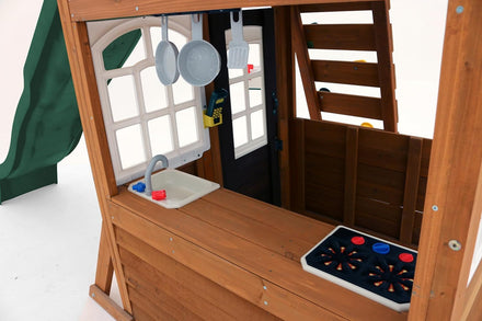 • Lower-level clubhouse with door, mailbox, windows, a play phone, stove, sink and accessories so kids can really feel at home