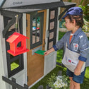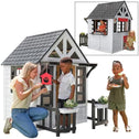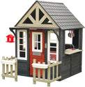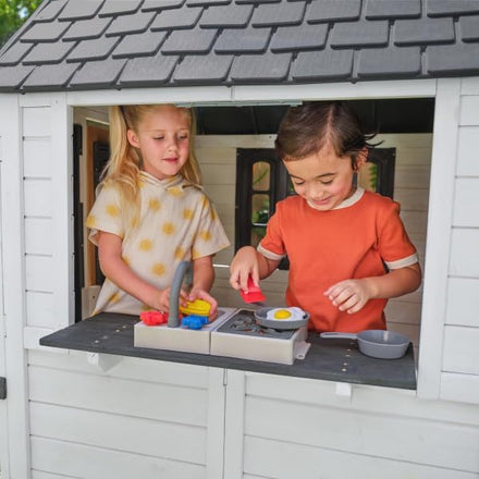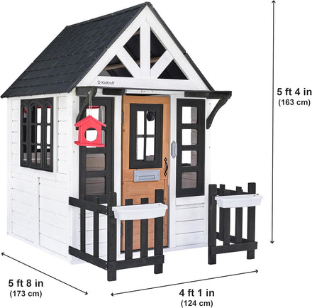 Every day in the backyard can be like a vacation with the KidKraft Riverscape Playhouse. Kids and parents alike will love the relaxing vibes that exude in the picket-fence yard with porch trellis overhang. Made of wood, this quaint cottage will inspire you to load up the sleeping bags and move in (at least for the day). Grow flowers or herbs in the planter boxes out front. Welcome feathered friends to the hanging birdhouse by filling it with birdseed. And invite pets (real or not) to enter in the fun vinyl flap door. Guests can really ring the doorbell and come join in the fun. Inside, you'll discover a sink, burner and utensils to make a home-cooked meal. The back of the playhouse boasts a spacious open window with covered fabric awning for a perfect place to serve up food or put on a puppet show. Chalkboards await art inspired by nature. Each and every moment spent in this adorable playhouse should be celebrated. Dress it up with balloons or other decorations to go along with the changing seasons, making it a year-round entertaining playspace. With durable construction, a maintenance-free plastic roof and weatherproof stain, there'll be many excursions to the Riverscape Playhouse in the future.