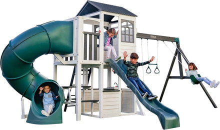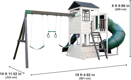 Rein in the wide open space of the backyard with the KidKraft Wrangler Way Swing Set—a unique melding of playhouse and playset in one attractive wooden set. "Home on the range" is the mantra of this expansive play structure that includes a two-story, white board clubhouse where kids can role play being pioneers on the prairie. The updated kitchenette includes a sink, faucet, burner and accessories so kids can cook up more modern imaginative meals. Climb up the ladder and then soar down using one of the two slides: either the curvy tunnel slide or the open-air wavy slide. Ramp up the action with a gallop on one of the three swings—a surefire way to feel the breeze and put smiles on faces. Take a load off at the attached table and benches. Its location underneath the upper deck gives kids a shaded location to snack or chill. Made of durable wood and coated with child-friendly, water-based stains, this set is created to last through the seasons.