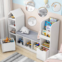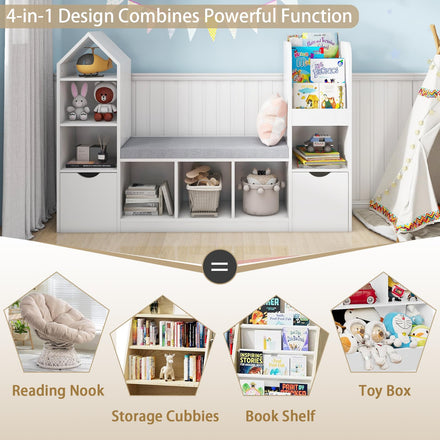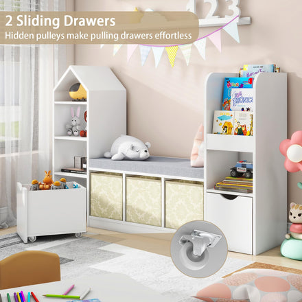 Kids Bookcase with Reading Nook, Bench Kids Bookshelf with 7 Storage Cubbies and 2 Movable Drawers, Multi-Purpose Toy Storage Organizer with Seat Cushion for Playroom, Bedroom, Living Room, White