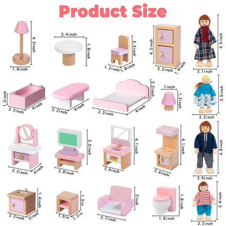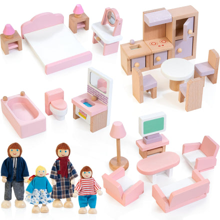 • 【Wooden Dollhouse Furniture Set】Add some fun to your dollhouse with this pink doll house accessories and furniture. This 26-piece set includes furniture for 4 rooms(living room, bathroom, kitchen, bedroom) and 4 family dolls(mother, father, son, daughter)