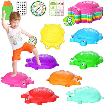 • An Exciting Springboard for Kids to Enhance Coordination and Balance Skills --- KIZJORYA 8 pcs toddler stepping stones offer rich sensory stimulation for your little one. Not only do they help children recognize colors, but they also develop balance and coordination skills while walking and jumping freely. It comes with a spinner, 30 activity cards, DIY eye stickers and storage bag. The package provides detailed instructions that clearly show a variety of interesting gameplay.