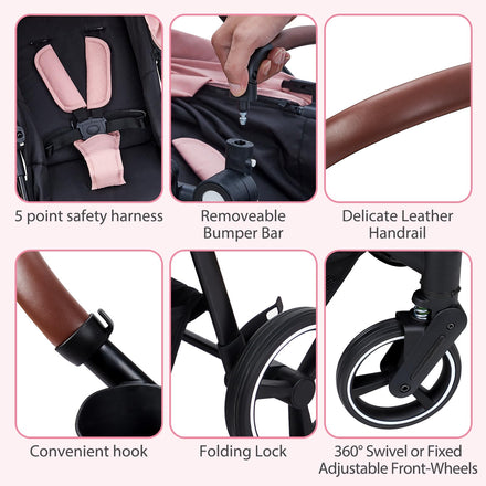 • [Peace of Mind Safety Features] The stroller features an advanced anti-vibration system with high quality springs on the front wheels to absorb bumps and provide a smooth ride on any terrain. The secure 5-point harness keeps your baby comfortable and safe, while the 360° swivel front wheel allows you to maneuver the stroller with ease. With the one-touch brake, you can stop the stroller quickly and safely when necessary, giving you peace of mind every time you go out.