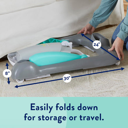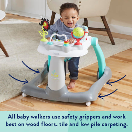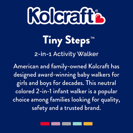 Celebrate your baby’s first steps with the Kolcraft Tiny Steps 2-in-1 Baby Activity Walker, designed to grow with your little one from sitting to standing. This versatile baby walker easily converts from a seated activity walker into a walk-behind push walker, helping support balance, coordination, and early mobility in a safe and playful way. Engage your child’s senses and imagination with a colorful play tray full of developmental activities. The sensory flower with a textured stem and crinkle sounds encourages tactile exploration, while the giant spinning ball and bead track support fine motor skill development. Flower petal loops are perfect for attaching a favorite plushie to keep playtime fun and engaging. The comfortable padded seat with a high supportive backrest ensures comfort during use, while the adjustable height allows the walker to grow with your baby for proper foot placement. A wide, sturdy base provides extra stability, swivel front wheels offer easy maneuverability, and non-skid pads help little ones come to a safe stop. The large snack tray with a built-in cup or bottle holder wipes clean easily, and the removable seat is machine washable for quick cleanup. When it’s time to store or travel, this foldable baby walker conveniently folds flat to just 30” x 24” x 8”. Designed for babies who can support their body weight with their legs, it accommodates children between 15 and 26 lbs and under 32” tall. Kolcraft, a trusted American family-owned brand since 1946, creates award-winning baby walkers that meet or exceed ASTM and CPSIA safety standards. With a legacy of quality and care, Kolcraft continues to design durable, safe, and engaging baby gear families love. The Tiny Steps 2-in-1 Activity Walker offers lasting value, comfort, and confidence as your baby learns to move, play, and explore.