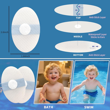 These children's shower ear covers are designed to prevent water from entering the ears, effectively reducing the risk of various ear problems and ensuring a safer, more enjoyable bathing experience for babies. The waterproof ear patches, sized at 2.6 x 1.64 inches, snugly wrap around the ears to form a tight seal against water, while built-in cotton balls absorb moisture to keep the ears dry at all times.​ Crafted specifically for baby bathing, hair washing, and swimming, our infant swimming earplugs are made of soft, elastic PU film with a skin-like texture, offering exceptional comfort and breathability. They conform seamlessly to the ear contour without causing any skin irritation. Using these ear patches is a breeze: simply tear off the lower white anti-stick layer, apply the waterproof cover to the ear, and remove the upper blue anti-stick layer. The transparent film covers the entire ear, with detachable anti-stick layers on both sides and a soft waterproof layer integrated with cotton balls for enhanced protection.​ These swimming ear patches are compact and easy to carry, making them perfect for travel—simply pack them in your luggage. Please note that they are designed exclusively for infant ears; Baby Ear Covers may not provide full coverage for adult ears.