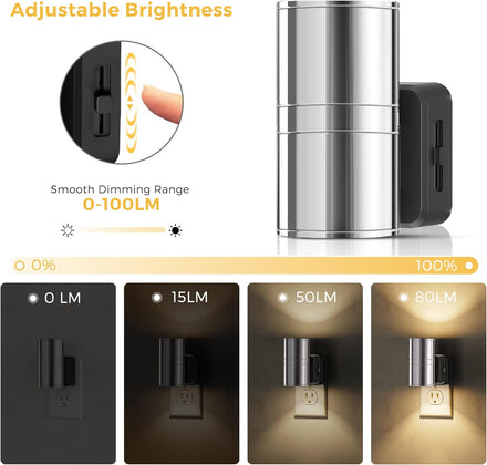• Dimmable Night Lights -- Stepless Dimming Technology enables 0-100LM luminance adjustment via intuitive button control, providing soft glow for bedroom sleep environments and ambient illumination for hallways/kitchens/bathrooms while preserving design harmony in modern interiors.