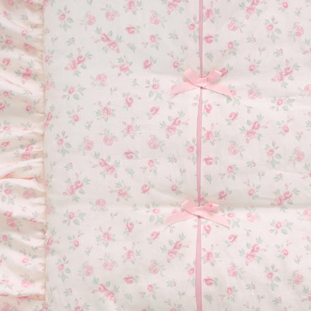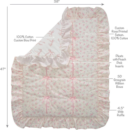 Little smiles, big style. This Coquette Floral aesthetic baby crib bedding set is the perfect blend of sweet and chic for your baby’s nursery. The 3 piece crib bedding set includes one quilt, one breathable 100% cotton fitted crib sheet, and one decorative crib skirt. The quilt features a charming floral pattern in soft hues of pink and green on a cotton sateen ground. There are pretty inset panels of pastel pink highlighted with soft pink bows and a gorgeous 4.5 inch shirred ruffle. There are watercolor pink blush bows on the back of the quilt. The breathable 100% cotton fitted crib/toddler sheet is a tossed print of dreamy florals on a soft white ground. There is elastic all the way around ensuring a safe and secure fit on a standard sized crib mattress that measures approximately 52 inches by 28 inches. The shirred crib skirt adds the finishing touch and is made in a double layered chiffon in a creamy white color.