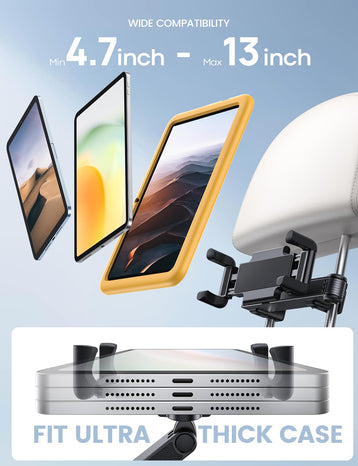 • 【Wide Compatibility】 This iPad car mount is compatible with 4.7 - 13" tablets and phones, and easily maximum support for 1"(26mm) thickness, such as 2024 iPad Pro 13 inch, Pro 11, iPad Air 6/ 5, iPad Mini, Galaxy Tab, Kindle, Fire HD, iPhone 16 Pro Max, Galaxy S25 Ultra, more; The adapted distance range of headrest rods is 3.7"(94 mm) - 6.3"(160 mm), the max diameter of the headrest hook is 0.51"(13 mm)