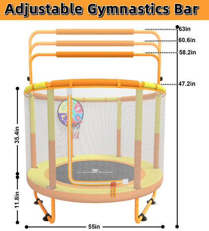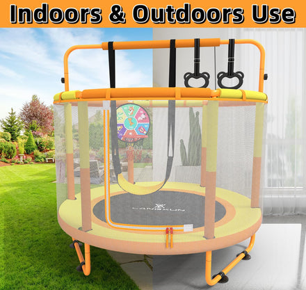 • [6-IN-1 MULTIFUNCTIONAL TRAMPOLINE] This trampoline not only provides jumping fun but also includes a basketball hoop, children's dartboard, swing, rings, and a gymnastics horizontal bar with three adjustable heights. It can also be used as a private safety house and tent for children. Let kids play to their hearts' content all day long. Suitable for indoor and outdoor use.