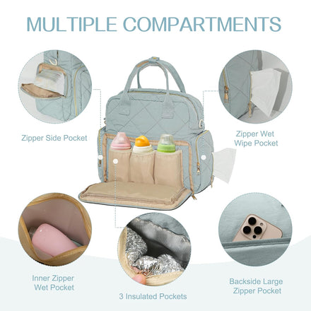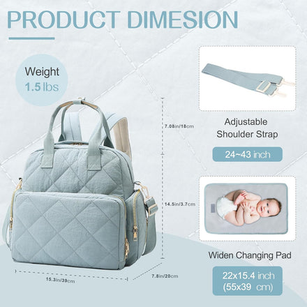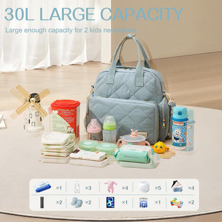 The spacious diaper bag is perfect for mothers to carry essential items for both mother and baby(even 2 kids) during their day out, such as baby diapers, clothes, formula, baby bottles, pacifiers, snacks, etc. Mom's breast pump, cosmetics, mobile phone, glasses, computer and other personal items.