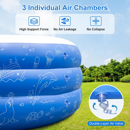 • 🏊【3 Air Chambers】With 3 individual lockable air chambers and dual-seal valves, this inflatable backyard pools stays fully inflated for long time. Each air chamber can support weights of up to 150kg, offering robust stability while preventing sagging and ensuring a stable aquatic experience.