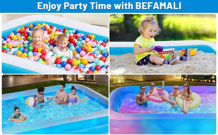 • Safety and Security: BEFAMALI Kiddie pools are made of Lead-Free and BPA-free materials, without toxic chemicals, and meet international standards. The pools use LED light strips for safety and durability, carefully designed and crafted