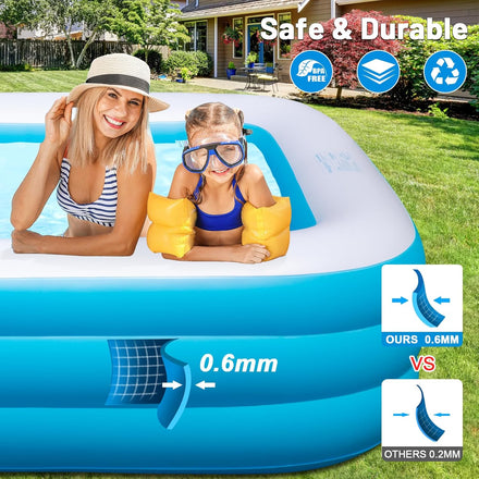 • Family Size Pool: The blow-up pool for family size is 130"x72"x22". It is enough for a family party. The pool is made of thickened PVC, strong and durable
