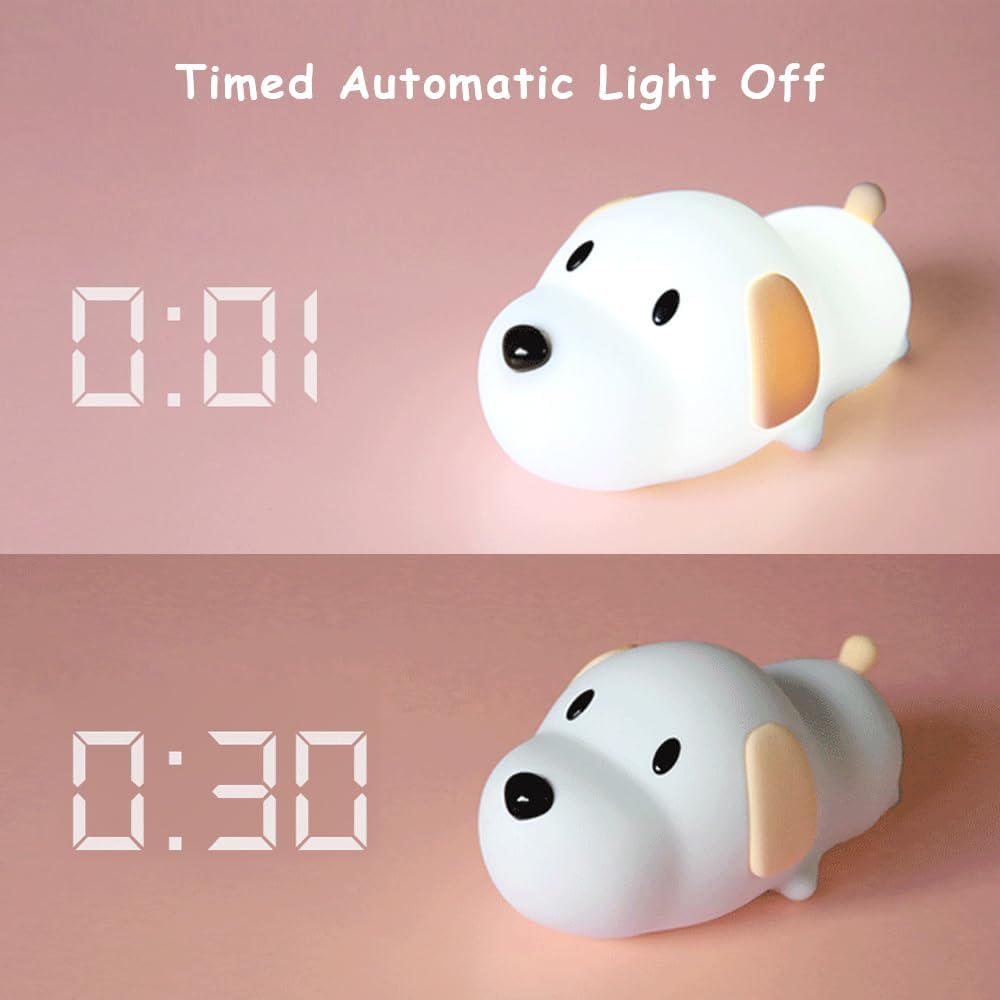 • 【Timed Turn Off Function】This luminous puppy has a timed turn off function. By short pressing the bottom button to select 30 minutes or 60 minutes, the night light will automatically turn off. The baby will fall asleep with a sense of security and will not be disturbed by any light. This product is equipped with a 1200mAh high-capacity lithium battery, which can be repeatedly charged using USB. The charging indicator light is red during charging, and it will turn off after 4-5 hours of full charge. High brightness can be used continuously for 10 hours.