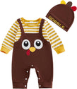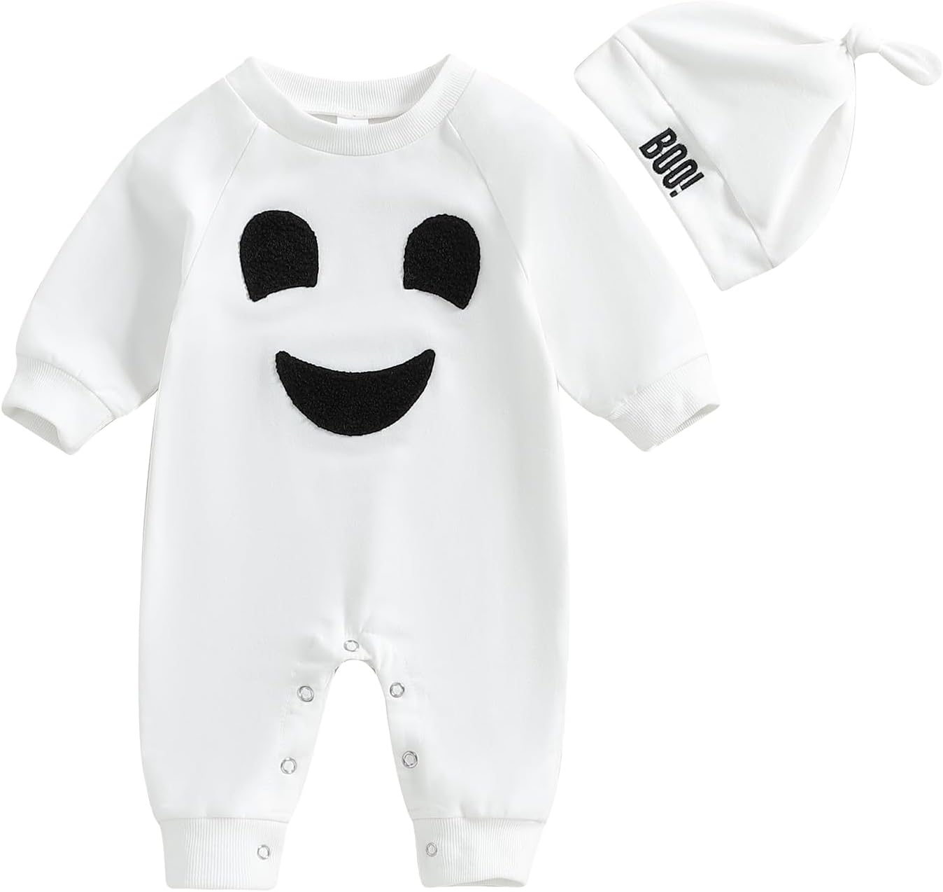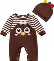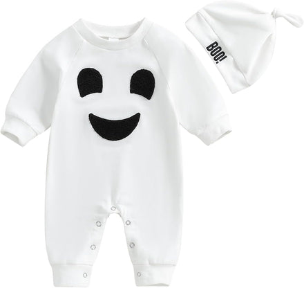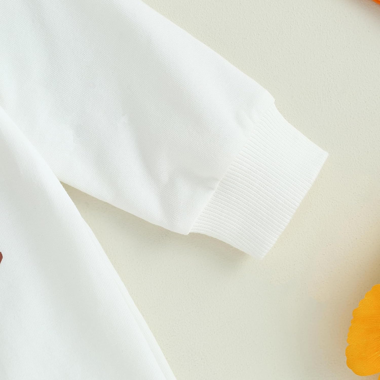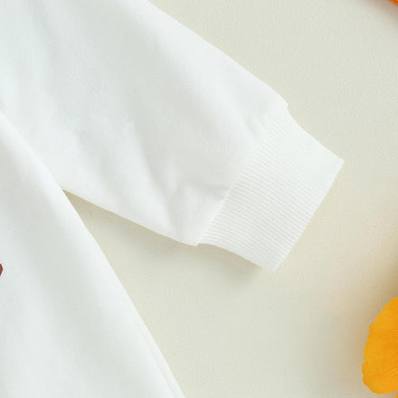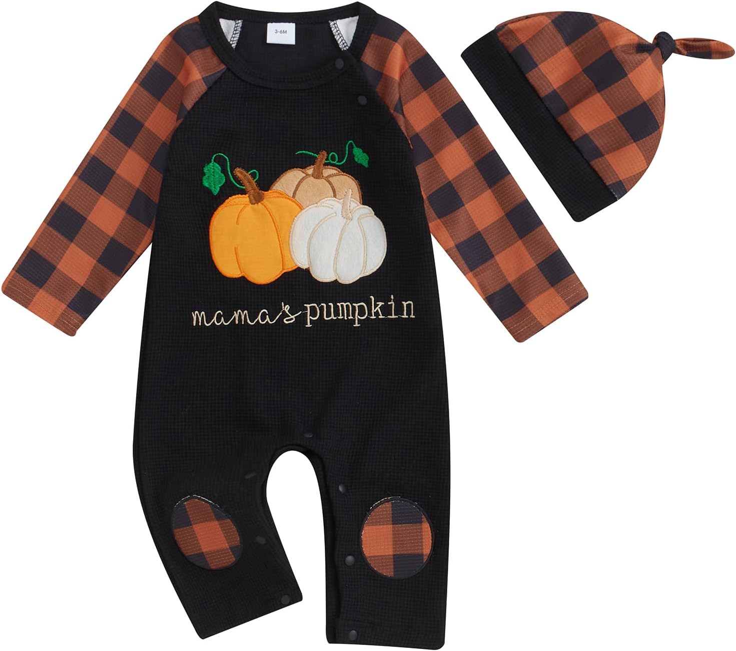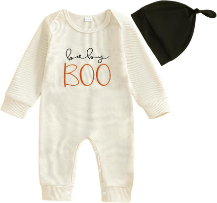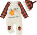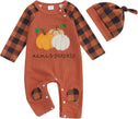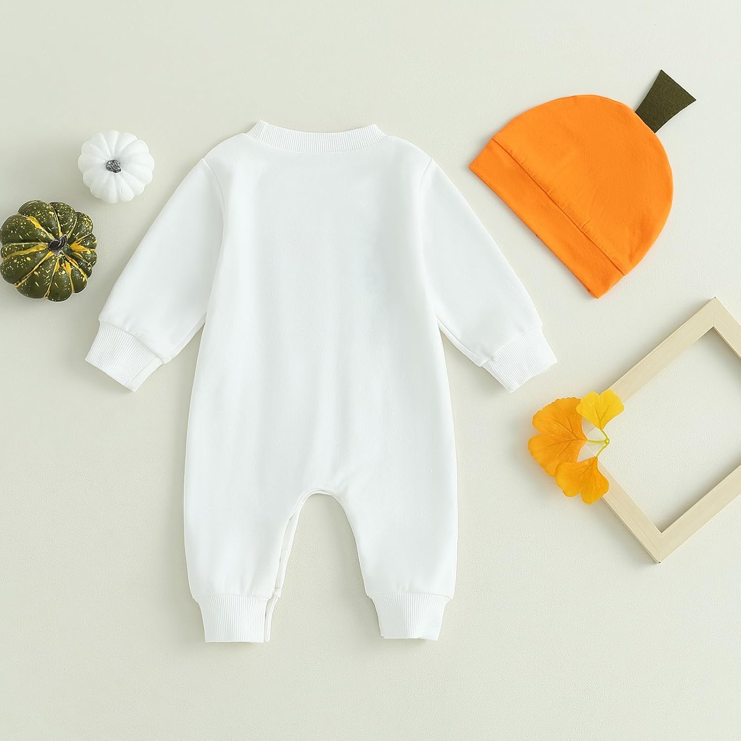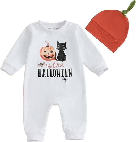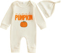 - DESIGN: pumpkin and letter print, crew neck, long sleeve romper white color, with orange hat, the snap closures at the bottom make it easy for diaper change